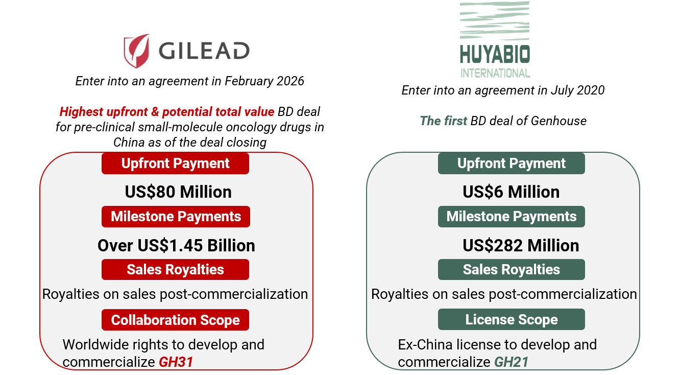Currently, under the leadership of our global R&D management team, Genhouse has built a pipeline centered on multiple high-value targeted oncology drugs and achieved breakthrough progress. In 2020, the Company out-licensed overseas rights of its SHP2 inhibitor to HUYABIO. In 2026, it entered into a global collaboration agreement with Gilead Sciences for its MAT2A inhibitor. These milestones demonstrate that our innovation capabilities and product value have gained recognition from MNCs, laying a crucial cornerstone for the Company to advance its internationalization strategy.