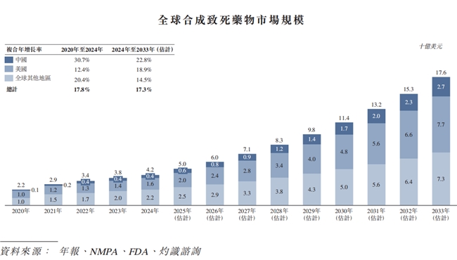 根据灼识咨询数据,合成致死药物赛道展现强劲增长潜力,2024 年全球市场规模达42亿美元,预计至 2033年将攀升至176亿美元,复合年增长率高达17.3%。下图载列2020年至2033年中国、美国及全球其他地区的合成致死药物市场规模。